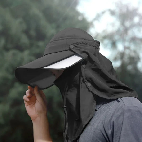 Com um design inteligente, possui uma aba larga que não apenas protege o rosto dos raios solares, mas também conta com um protetor de pescoço integrado.