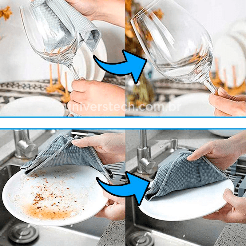 Para usá-lo úmido, primeiro molhe e depois torça o excesso de água. Este método é adequado para limpar e polir uma variedade de superfícies.